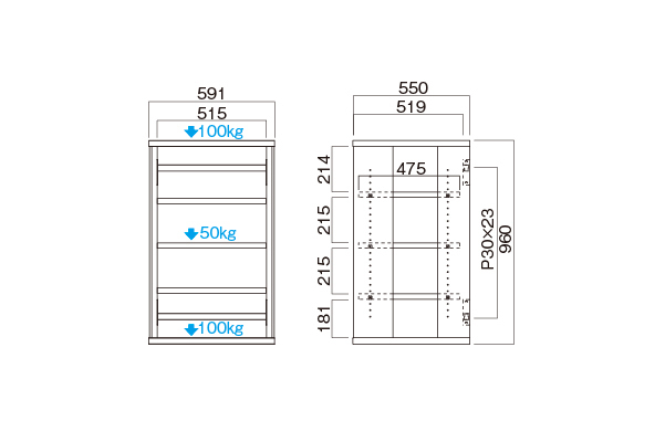 | 備考 | 天板 耐荷重:100kg以下 棚板 耐荷重:50kg以下 底板 耐荷重:100㎏以下 |