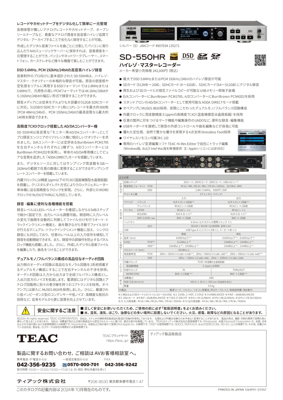 SD-550HRは、レコードやカセット、オープンリールなど、大切なアナログ資産を高音質で録音することができるハイレゾ・マスターレコーダーです。録音メディアにはSDカードを採用。DSD 5.6MHzやPCM 192kHz/24bitの高解像度で録音でき、本体で思いのままに編集することができます。 |