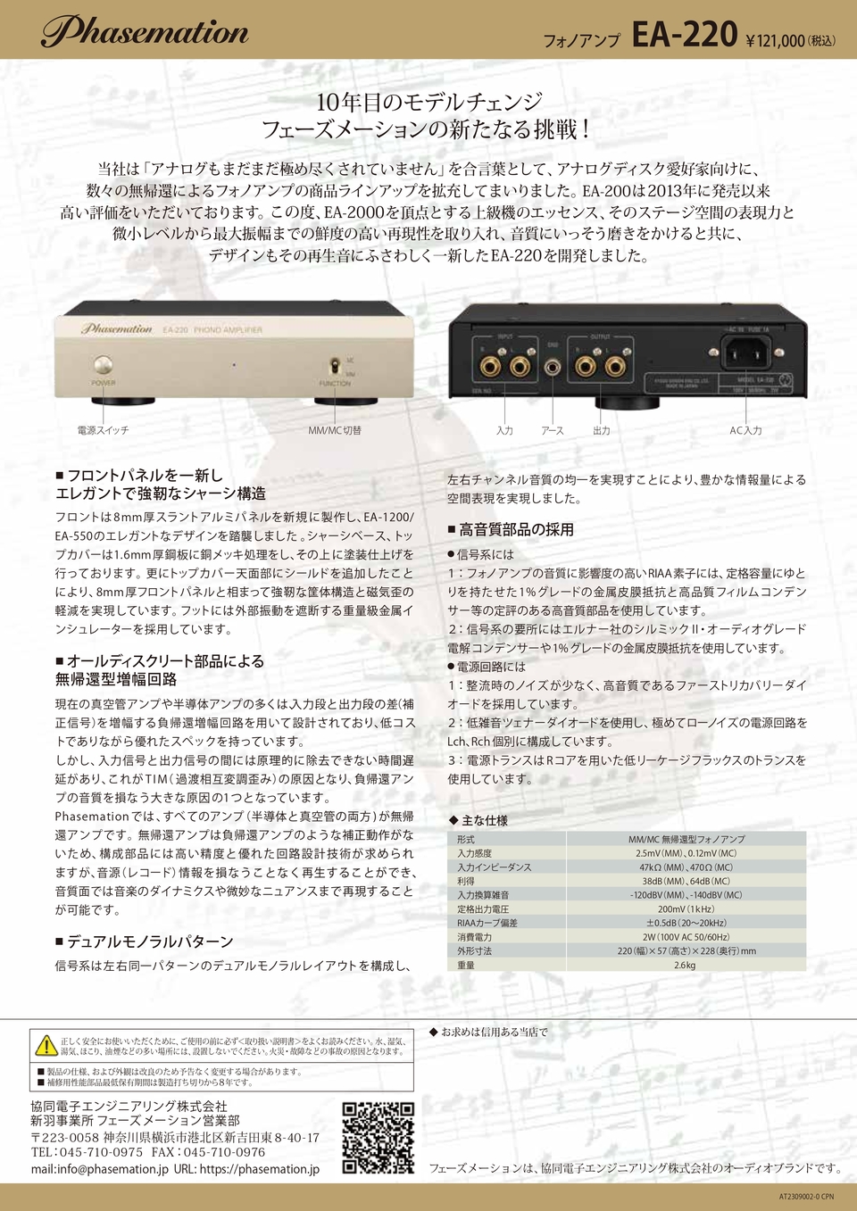フェーズメーション(Phasemation)=位相と情報を合わせた造語です。フェーズメーションの求める音質は、「音楽演奏のステージ感」として、聴者の前面に聴感上のステージが再現され、しかも、奏者の情念までもが再現されることです。それは、ステージの広がり(楽器の位置、奥行き、高さ)、そして、音の鮮度のことを言います。「これが実現された時が真のステレオ再生である」との信念に基づいております。フェーズメーションは、真摯なオーディオファンと共に、如何に生演奏の「らしさ」を再生するかを追い求め、アナログオーディオの楽しみと深みを伝え続けていきます。